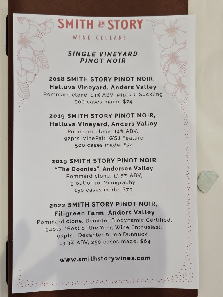 Tasting at Smith Story Wines was a vibrant and heartfelt experience. With a focus on honest winemaking and expressive varietals, each pour reflected the passion and care that define their philosophy. From elegant Pinot Noirs to bright, approachable whites, the lineup was both charming and memorable.
