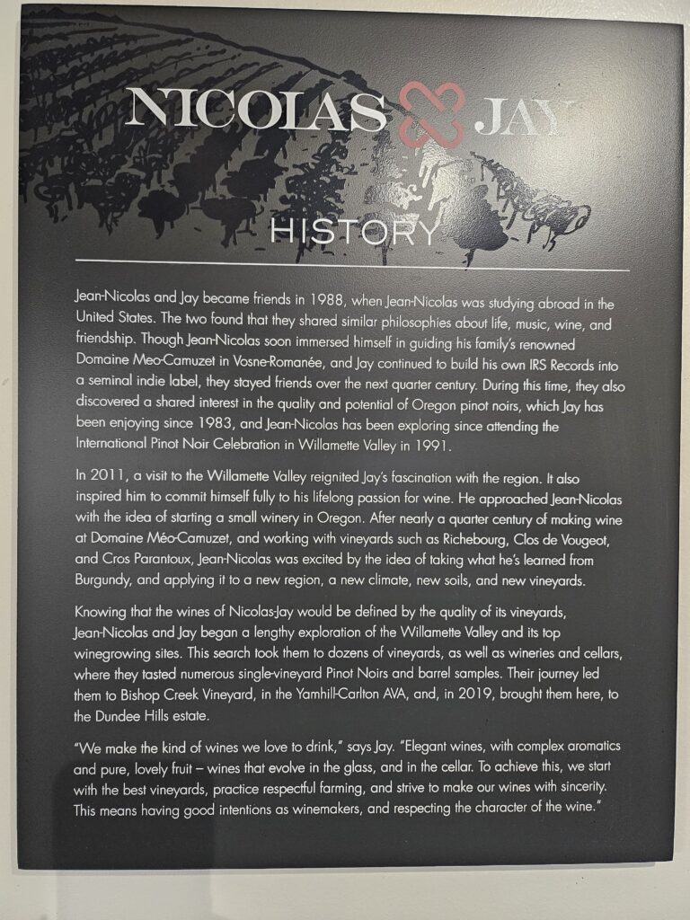 My tasting at Nicolas-Jay was a seamless blend of Burgundian finesse and Oregon soul. Set in the Dundee Hills, the experience highlighted the estate’s commitment to biodynamics, precision, and expressive winemaking. Each wine—whether from their estate vineyards or select sites—offered clarity, elegance, and a profound sense of place. A meeting point of tradition and exploration, delivering Pinot Noir with both structure and soul.